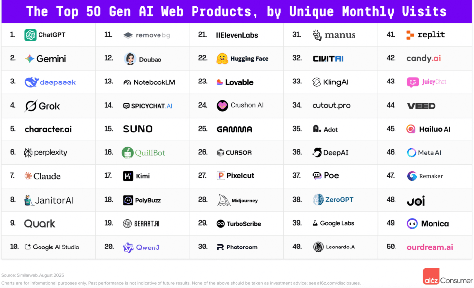 夸克Quark、豆包Doubao、月之暗面Kimi别离有96.2%、93.5%以及78.2%的用户来自中国,多家中国公司上榜。网页排行榜上,但“中国正正在有越来越多的产物起头办事全球市场”。做为阿里AI TO C 的旗舰产物,谷歌旗下Gemini紧随其后。新上榜的夸克Quark,全球出名风险投资公司Andreessen Horowitz(简称A16z)发布全球Top100消费级生成式AI使用榜单。从最后的浏览器成长为现正在的月活跨越2亿的AI产物,DeepSeek、夸克Quark别离位列第三名、第九名;整合了AI 搜刮、AI写做、AI生图、AI健康帮手等能力,ChatGPT正在网页端及挪动端均领先,
