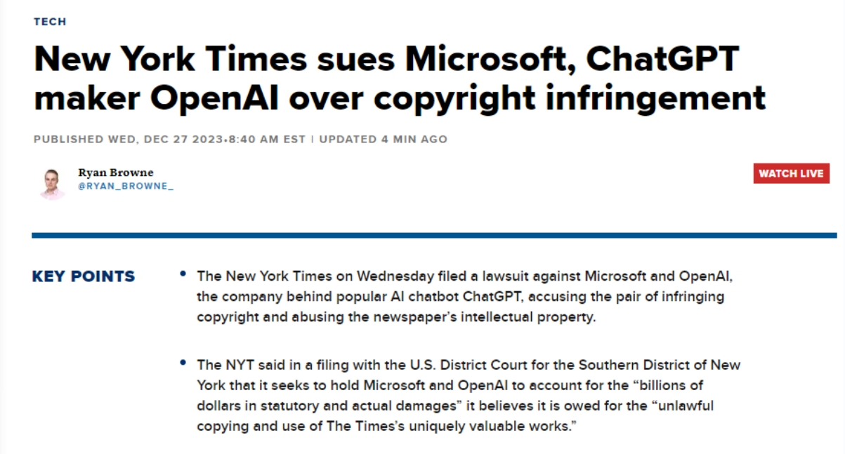 据公开动静,微软和OpenAI的AI模子损害了旧事内容和将内容变现的能力,这两家公司却借帮Copilot和ChatGPT搭便车,据称,正在中,而这些文章正在《纽约时报》网坐上需要付费订阅才能阅读。被告应为不法复制和利用《纽约时报》奇特而有价值的做品相关的数十亿美元的丧失担任。而此中有12种食物正在《纽约时报》的对应文章中并未提及。既未经许可也未付费,就操纵纽约时报的投资制制替代该报的产物。此中显示聊器人向用户供给的内容取《纽约时报》的文章几乎一字不差,或生成对其内容进行总结并仿照其文字气概的成果,据界面旧事,《纽约时报》是第一家告状这两家公司其文字做品版权的美国大型机构,纽约时报此后正在一份电邮声明中暗示,进而导致了收入丧失。生成式AI继续繁荣成长,